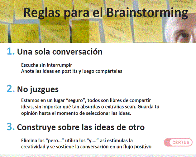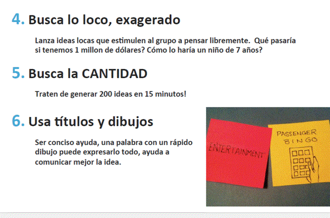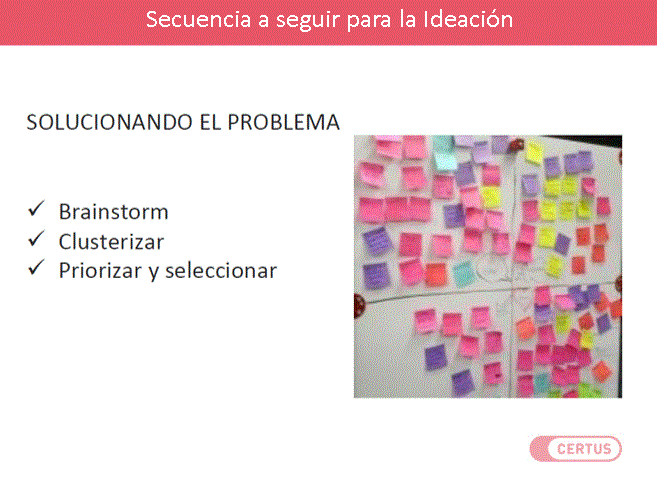 IDEA: Un vez definido el problema se deben idear soluciones. En esta etapa se estimula el pensamiento divergente, alternando con el convergente. Para lograr esto, se debe contar con un equipo multidisciplinario donde todos aporten desde su visión particular. Una técnica común es hacer lluvias de ideas con representaciones visuales para explorar nuevas alternativas. Luego, se analizan las distintas propuestas para seleccionar el mejor enfoque de cada una. Finalmente, se traducen en conclusiones que lleven a la selección final de las posibles soluciones.